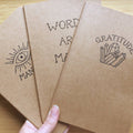 These lightweight and portable journals feature 36 blank white pages and a flexible Kraft covers hand-stamped with the artist Victoria Ann Meyers' original designs.